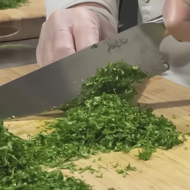 سكين شيف أساسي من منال العالم، مصمم ليكون العمود الفقري لأي مطبخ احترافي أو منزلي متقدم. مصنوع من فولاذ ألماني عالي الجودة ليمنحك قوة، توازن، وأداء ثابت في جميع مهام الطهي اليومية.
